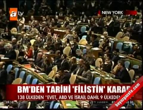 Birleşmiş Milletler'de yapılan oylamada 138 ülkenin Evet yönünde oy kullanmasıyla birlikte Filistin'e "Üye Olmayan Gözlemci Statüsü" verildi.