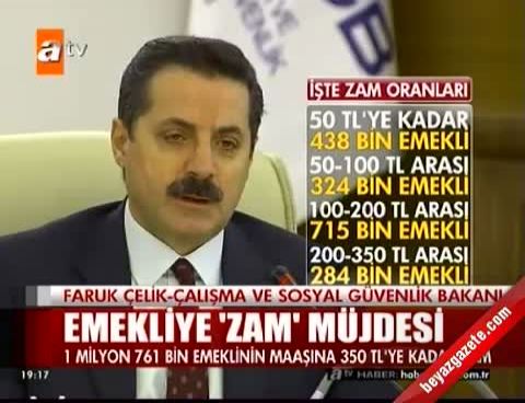 Çelik, maaş adaletsizliğini giderecek düzenleme ile emeklilerin hesabına 50 TL'den 350 TL'ye kadar yansıma olacağını dile getirdi. Çelik'in verdiği bilgiye göre emekli maaşı artışı en en çok 100 ile 200 lira arasında yapıldı. Bu artıştan 715 bin emekli faydalandı. 284 bin emeklimizin maaşlarında 200 ile 350 TL arası iyileştirmeler yapıldı. Yürürlüğe giren İş Sağlığı ve Güvenliği Kanunu ile birlikte 1 Ocak’tan itibaren kamu ve özel bütün iş yerlerinin risk değerlendirmesine gireceğini de hatırlatan Çelik, risk değerlendirmesine girmeyen iş yerlerine bin TL’den 4 bin 500 TL’ye kadar idari ceza uygulanacağını bildirdi. Basın mensupları bakanlık çalışmalarını değerlendirme toplantısında bir araya gelen Bakan Faruk Çelik, önemli açıklamalarda bulundu. Konuşmasına, "2 milyon emeklimizin maaş adaletsizliğini gideren intibak düzenlemesini gerçekleştirdik." sözleri ile başlayan Çelik, “Bu düzenleme ile 438 bin emeklimizin maaşında 50 TL’ye kadar iyileştirmeler, 324 bin emeklimizin 50 ile 100 TL arasında iyileştirmeler 715 bin emeklimizin maaşlarında ise 100 ile 200 TL arası iyileştirmeler, 284 bin emeklimizin maaşlarında 200 ile 350 TL arası iyileştirmeler yapıldı. Emeklilerimizin intibaktan doğan hakları Ocak 2013’ten itibaren, yeni yılla birlikte maaşlarına yansıtılacaktır.” diye konuştu.