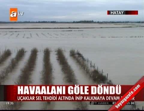 26 Aralık 2012 Çarşamba günü yayınlandı Hatay’da son bir haftadır etkisini sürdüren şiddetli yağışlar nedeniyle sular altında kalan Hatay Havaalanı'nda belli aralıklarla uçuşlara ara verildi.