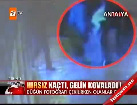 Antalya'da gelin arabasının içindeki altın olduğunu zannettikleri çantayı çalan hırsızlar kaçarken, gelinin hırsızları kovaladığı anlar güvenlik kamerasına yansıdı.