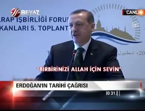 Türk-Arap İşbirliği Forumu Dışişleri Bakanları 5'inci Toplantısı'nda konuşan Başbakan Recep Tayyip Erdoğan, Filistinlileri kendi aralarında yaşadıkları sorunları bir an önce çözmeye çağırırken, "Birbirinizi Allah için sevmenizi istiyoruz" dedi.