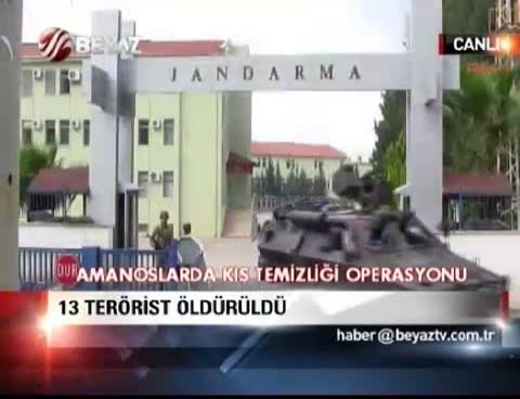 ''Amanoslar bölgesinde kış üstlenmesine engel olmak ve bölücü terör örgütü mensuplarını etkisiz hale getirmek maksadıyla, son dönemlerde icra edilen operasyonlarda 13 ölü, 5 sağ olmak üzere toplam 18 terör örgütü mensubu etkisiz hale getirilmiştir. İcra edilen operasyonlarda 8 adet kaleşnikof, 8 adet M-16 piyade tüfeği, 1 adet RPG-7, 3 adet RPG-7 mühimmatı, 21 adet el bombası, 72 adet fünye, 100 gram A-4 patlayıcı madde, 12 adet patlayıcı düzeneği, 4'ü terör örgütü mensuplarının Kuzey Irak'taki ana karargahları ile görüşmelerde kullandıkları büyük telsiz olmak üzere toplam 10 adet telsiz, 3 adet dürbün, çok miktarda patlayıcı madde yapımında kullanılan malzeme ile bol miktarda yiyecek ve yaşam malzemesi ele geçirilmiştir.''