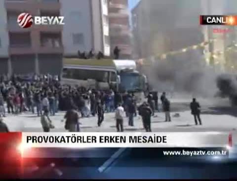 Alınan tüm önlemlere rağmen kutlamaların yapılacağı nevruz alanına giren yaklaşık 3 bin kişilik grup, burada bulunan GSM şirketlerine ait seyyar şebeke araçları ile bir canlı yayın aracını ateşe verdi. Görgü tanıkları araca molotof ya da ses bombası atıldığını dile getirdi.