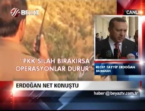Başbakan Erdoğan, Barzani ile olan dünkü görüşmesinin gündeminde PKK'nın olmadığını belirterek "Kuzey Irak'la olan görüşmelerimizde her zaman gündemde olan bir başlık çünkü bölücü terör örgütünün bizim çağrımıza göre silahı bırakması lazım. Silahı bıraktığı andan itibaren de zaten bizim Türkiye Cumhuriyeti olarak tavrımız, operasyonların durdurulması istikametindedir. Ama silahlar bırakılmadığı sürece devletin de operasyonları durdurması söz konusu değildir" dedi.