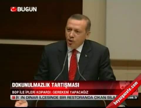 Başbakan Recep Tayyip Erdoğan, AK Parti genel merkezindeki topalantıda konuştu. BDP'li vekiller ile PKK'lı teröristlerin kucaklaşmasını değerlendiren Başbakan Erdoğan, 'Kameralar olmasaydı, terörist efendilerinin ellerini de öperlerdi. Üç kuruş da harçlık alırlardı' dedi. Başbakan Erdoğan bu değerlendirmesi ardından 'Parlamentoda gereğini yapacağız' şeklinde konuştu.