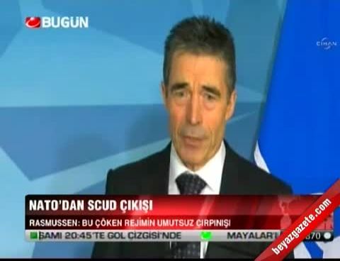 NATO karargahında gazetecilere konuşan Rasmussen, "Bu eylemleri, çöküşe doğru giden bir rejimin umutsuz çırpınışları olarak görüyorum." dedi.
