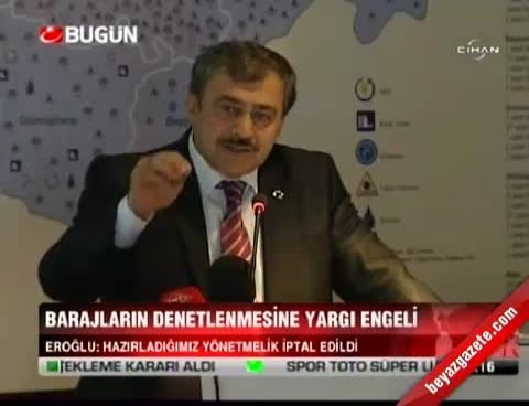 Hukuk müşavirliğine talimat verdiğini ve Danıştay 'ın iptal gerekçelerini de inceleyerek bir çalışma yaptıklarını bilgisini veren Bakan Eroğlu, 'Bir boşluğun olmaması gerekir. Bütün su yapıların sahibi DSİ 'dir. Dolayısıyla DSİ tarafından ve bir yönetmelikle denetlenmesi ve denetlettirilmesi gerekir. Bizim düşüncemiz şuydu; HES, baraj, gölet ya da sulama tesis yapan firma bir mühendislik mimarlık denetim şirketi ile çalışsın, o da biz denetleyelim diye bir çalışma yapmıştık. Ama maalesef bir dernek itiraz etti, İdare Mahkemesine dava açtı, Danıştay 'da görüldü ve yönetmelik iptal edildi. ' diye konuştu.
