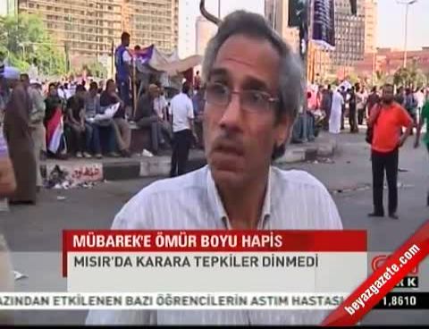 Kalabalık, mahkemenin kararını protesto ederek, askeri yönetim karşıtı slogan attı. Mısır’da Mübarek müebbet hapis cezasına çarptırılırken, oğulları Ala ve Cemal aleyhindeki suçlamaların düşürüldü. Mısır kanunlarına göre müebbet hapis, 25 yıl hapis anlamına geliyor.Mısır’da Mübarek’e verilen cezayı az bulan muhalifler, ülkede tekrar devrim yapacaklarını ifade ediyor. Muhalifler, Mübarek’in az ceza almasından iktidardaki Yüksek Askeri Konsey'i sorumlu tutuyor. Kararı protesto eden binlerce kişi dün gece Tahrir meydanında toplandı. Göstericiler askeri yönetim ve Mübarek döneminin son başbakanı ve cumhurbaşkanı adayı olarak ikinci tura girecek general Ahmet Şefik aleyhine slogan attı. Gösteriye Mısırlı tanınmış alimlerden Safvet Hicazi ile cumhurbaşkanlığı seçimlerinin birinci turundaki adalardan Hamdin Sabahi de katıldı.