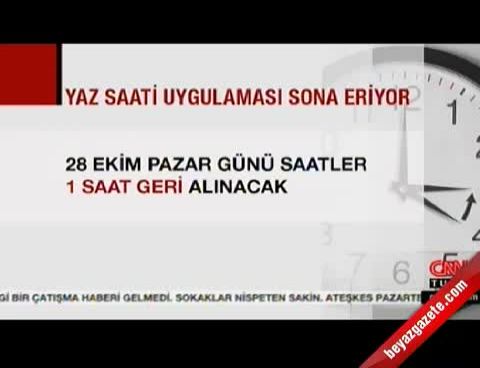 28 Ekim Pazar günü (Cumartesiyi Pazara bağlayan gece) saat 04.00'te saatler 1 saat geri alınacak.