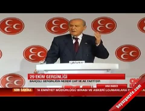 “Cumhuriyetin tek sorumlusu olduğunu düşünen CHP keşke teröre de aynı hassasiyetle yaklaşabilseydi. Keşke CHP, sözde Kürt soruruna, PKK taleplerine bakmak yerine, Cumhuriyetin haklarını koruyacak yüreği gösterseydi. Oslo şartlarına bakmasaydı ve İmralı canisine görüşmeye tamam demeseydi. İlk önce idrak, ardından mangal gibi yürek gerekli. MHP'de bu inanç bu yürek fazlasıyla var. Ne laikliği istismar eden CHP'nin ne de AKP'nin buna ihtiyacı yoktur. İzmir'den sesleniyorum ki Cumhuriyetin bayramının üzerinden hiçbir şey geçmemelidir.”
