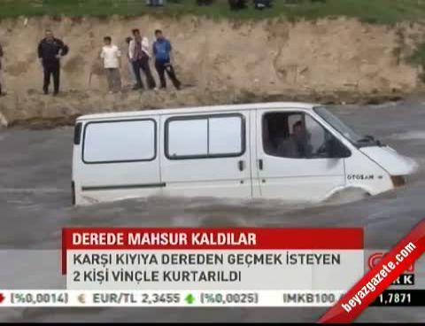 20 Nisan 2012 Cuma günü yayınlandı Bursa'da, Uludağ'daki eriyen karlarla su seviyesi yükselen dereden geçmek isteyen bir minibüsteki 2 kişi dere ortasında mahsur kaldı.