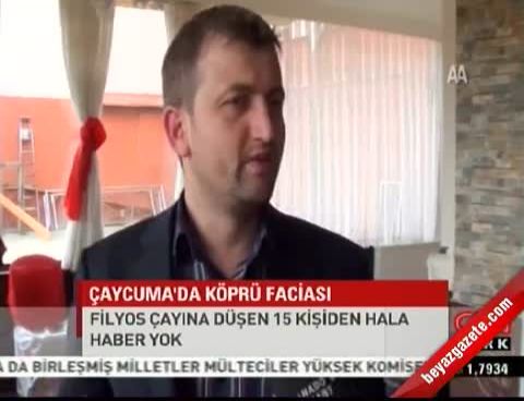 8 Nisan 2012 Pazar günü yayınlandı Zonguldak'ın Çaycuma ilçesinde Filyos çayı üzerinde bulunan köprü çöktü. Köprü üzerinde bulunan bir minibüs ve bir otomobil çaya düştü. Olayda kaybolan 15 kişiyi arama çalışmalarına devam ediliyor. Çalışma ve Sosyal Güvenlik Bakanı Faruk Çelik yaptığı açıklamada, tüm imkanları seferber ettiklerini söyledi.