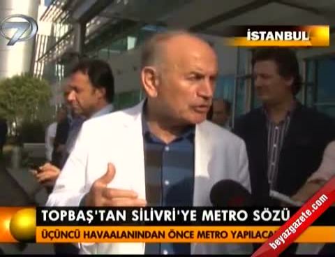 İstanbul Büyükşehir Belediye Başkanı ve UCLG Başkanı Kadir Topbaş metronun Silivri'ye kadar gideceğine dair söz verdiklerini belirterek 'Proje hazır ' dedi. Napoli'de 6. Dünya Kentsel Formu'na katılan Başkan Kadir Topbaş, yurtdışındaki temaslarının ardından dün akşam saatlerinde eşi Özleyiş Topbaş ile birlikte İstanbul'a döndü. Topbaş Atatürk Havalimanı VİP Salonu çıkışı basın mensuplarının sorularını yanıtladı.