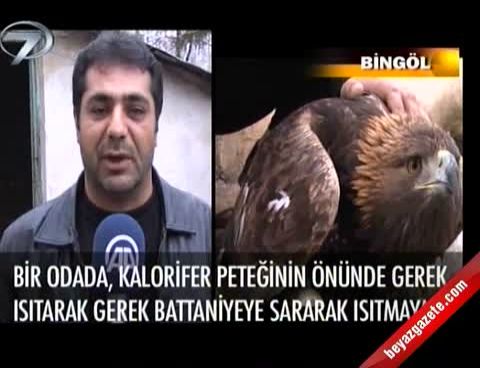 Bingöl'de, kanatları açıldığında 2 metre 40 santim uzunluğunda ve 7 kilo ağırlığındaki bir kaya kartalını donmak üzere iken bulan vatandaş, kartalı evinde besliyor.