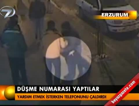 Erzurum'da buzda düşme numarasıyla bir vatandaşın cep telefonunu çalan yankesiciler bir iş yerinin güvenlik kamerasına yakalandı.