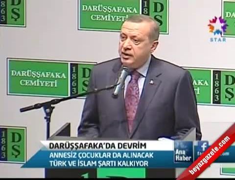 Başbakan Recep Tayyip Erdoğan, Darüşşafaka eğitim kurumlarında öğrenim görme şartları arasında yer alan ‘Türk ve İslam olma’ şartının ‘Türkiye Cumhuriyeti vatandaşı’ olarak değiştirildiğini söyledi.