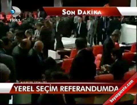 Erken yerel seçim teklifi, TBMM Genel Kurulu'nda 'referandum eşiği'nde kabul edildi. Cumhurbaşkanı'nın yasa değişikliğini onaylaması durumunda referanduma gidilecek. Bu sürpriz gelişme karşısında AK Parti grubu acil olarak toplandı.