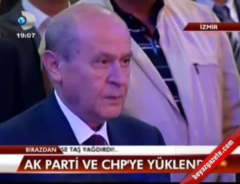 MHP lideri Devlet Bahçeli, İzmir 'de yaptığı konuşmada, İzmir 'in milli ve manevi değerlere sahip çıkmasındaki cesaretini överek, AKP ve CHP 'yi milli değerleri korumamakla suçladı. Bahçeli, konuşmasında şu ifadeleri kullandı: