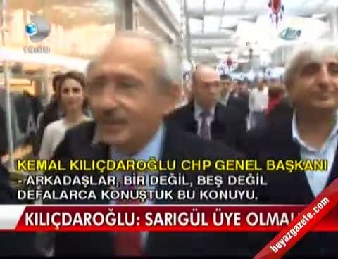 Kılıçdaroğlu alışveriş merkezine girişi sırasında basın mensuplarını Şişli Belediye Başkanı Mustafa Sarıgül'ün İstanbul Büyükşehir Belediye Başkanlığına CHP'den aday gösterileceği iddialarına ilişkin sorularını yanıtladı. Kılıçdaroğlu,'Sarıgül'ün önce partiye bir üye olması gerekir. Bu konuda daha önce çok konuştum, bu kadar yeter' diye yanıt verdi.