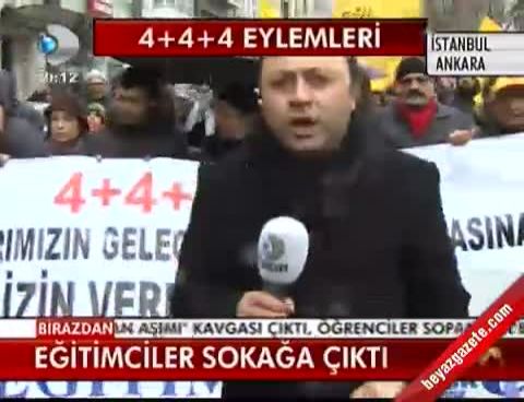 Eğitim-Sen üyesi yaklaşık 500 kişilik grup, TBMM 'de görüşülen yeni eğitim sistemini protesto etmek için Harbiye 'de toplandı. '4+4+4 ile çocuklarımızın geleceğinin karartılmasına izin vermeyeceğiz 'yazılı pankart açan grup, Cumhuriyet Caddesi üzerinden Taksim 'e doğru yürüyüşe geçti. Grup yürüyüş boyunca 'Gün gelecek devran dönecek AKP halka hesap verecek ', 'AKP yasanı al başına çal ', 'Parasız eğitim parasız sağlık ', 'Parasız bilimsel anadilde eğitim 'şeklinde slogan attı. Polisin geniş güvenlik önlemi aldığı protesto gösterinde Taksim 'e ulaşan grup adına basın açıklamasını Eğitim-Sen İstanbul 3. No 'lu Şube Başkanı Hüseyin Tosun okudu.