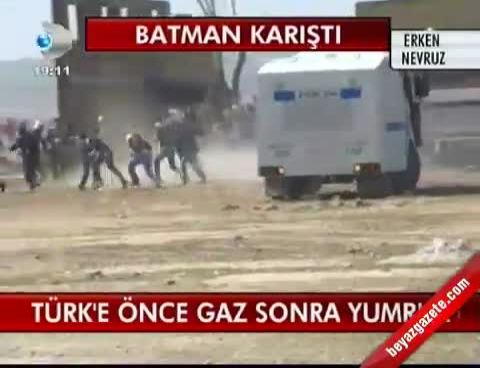 Polisin Batman 'daki olaylar sırasında kalabalığı dağıtmak için kullandığı gaz bombalarından biri Bağlar Mahallesi Nergiz Caddesi üzerinde nevruz alanına giden BDP otobüsüne isabet etti.
