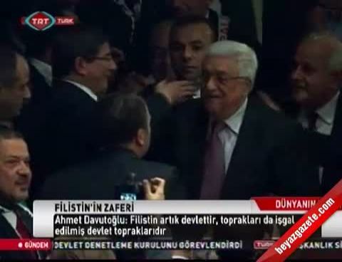 Dışişleri Bakanı Ahmet Davutoğlu, Filistin'e Birleşmiş Milletler (BM) Genel Kurulu'nda yapılan tarihi oylamada, 'gözlemci kuruluş' yerine 'gözlemci üye olmayan devlet' statüsü kazandıran kararı, "Bu kararla Filistin artık devlettir; ve Filistin toprakları, işgal edilmiş devlet topraklardır.