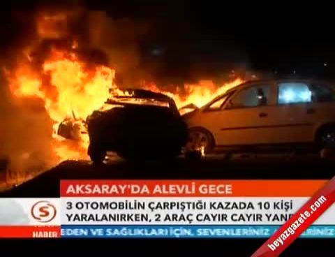 Aksaray'da meydana gelen 3 aracın karıştığı zincirleme trafik kazasında 10 kişi yaralanırken, çarpışmanın etkisiyle 2 otomobil alev alev yandı.