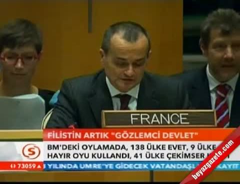 Birleşmiş Milletler'de yapılan oylamada 138 ülkenin Evet yönünde oy kullanmasıyla birlikte Filistin'e "Üye Olmayan Gözlemci Statüsü" verildi.