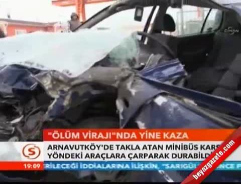 Bir otomobille çarpışan minibüs yan yattı. Kazada yaralanan 5 kişi ambulanslarla hastaneye kaldırıldı. Kaza, Eski Edirne Asfaltı Şehit Piyade Çavuş Ahmet Öztürk Kışlası mevkisinde saat 09.00 sıralarında meydana geldi. İddialara göre, 34 ZEA 92 plakalı minibüsüyle Habibler istikametine gitmekte olan Mustafa Kuru, askeri kışla karşısında direksiyon hakimiyetini kaybetti. Kontrolden çıkan minibüs orta refüjü aşarak karşı yöne geçti. Necmettin Altunordu’nun kullandığı ve içerisinde 4 kişi bulunan 34 ZG 184 plakalı otomobille kafa kafaya çarpıştı. Yan yatarak sürüklenen minibüsün sürücüsü Mustafa Kuru yola fırladı. Arnavutköy istikametine ilerleyen 34 ET 4692 plakalı hafriyat kamyonunun soförü Şinasi Mutlu da yola fırlayan Kuruy’a çarpmamak için manevra yaparak kamyonu yol dışına çıkarttı. Hafriyat kamyonu yol kenarındaki toprak alana çarparak durdu.