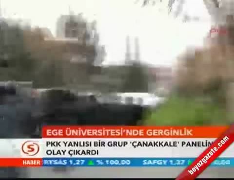 Ege Üniversitesi'nde (EÜ) düzenlenen "Çanakkale Zaferi" ile ilgili panele katılan bir grup öğrenci, paneli izlemeye gelen öğrencilere saldırdı. Darp edilen öğrenciler polis tarafından kurtarıldı.