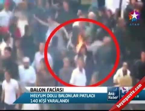 Patlama anı kameralara yansırken, balonların içindeki gazın patlama esnasında çevreye yayılması sonucu çevresindeki insanların elbiselerinin alev aldığı görüldü.