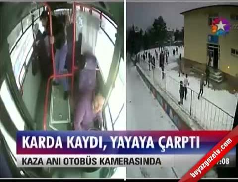 Kaza anı, halk otobüsünün güvenlik kamerasına yansıdı. Görüntülerde, otobüsün kar ve buzlanma nedeniyle kontrolden çıkarak, yayaya çarpma anı yer alıyor.