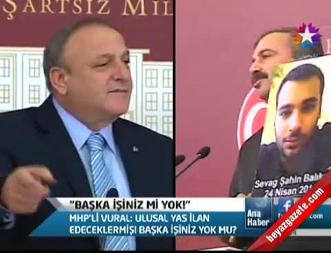 BDP'li Milletvekili Sırrı Süreyya Önder'in "Hiçbir insan ötekinin evi üzerinde oturmamalı." sözlerini de hatırlatan Vural, "Sen bu millete işgalci mi demek istiyorsun? Sen kimsin? Haddini bil." diye seslendi. BDP ile AK Parti'li bir milletvekilinin soykırım konusundaki görüşlerinin benzer olduğunu öne süren Vural, "İktidar partisinden uçan bir milletvekili var. 'Özür dilensin' diyor. Bunlar tesadüf mü? Aynı merkezden yönlendiriliyorlar. Bu anlayış, emperyalistlerin oyuncağı olan bir anlayıştır. Bunlar beraber tarihimize kara leke sürmek için her türlü fırsatı kolluyorlar. Ey AKP milletvekilleri, BDP'lilerle beraber imzayı atın, getirin bakalım yüreğiniz varsa. Hodri meydan." dedi.