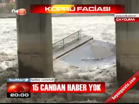 8 Nisan 2012 Pazar günü yayınlandı Zonguldak'ın Çaycuma ilçesinde Filyos çayı üzerinde bulunan köprü çöktü. Köprü üzerinde bulunan bir minibüs ve bir otomobil çaya düştü. Olayda kaybolan 15 kişiyi arama çalışmalarına devam ediliyor. Çalışma ve Sosyal Güvenlik Bakanı Faruk Çelik yaptığı açıklamada, tüm imkanları seferber ettiklerini söyledi.