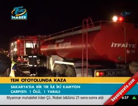 1 TIR ve 2 kamyonun karıştığı kazanın ardından yolun Ankara istikameti saatlerce ulaşıma kapandı. Kilometrelerce uzunlukta araç kuyruğu oluştu.Otoyolun Ankara yönünde seyreden Haşim S.'nin kullandığı 55 RM 919 plakalı TIR, Akyazı gişeleri mevkisinde aynı yöne giden Sadık Elmacı yönetimindeki 19 FD 812 plakalı kamyona çarptı. Aynı yönde seyreden Alaattin Çelik yönetimindeki 06 BAK 20 plakalı kamyon da kaza yapan araçlara arkadan çarptı.Silikon ham maddesi ve elektronik eşya taşıyan araç alev aldı. Koltuğunda sıkışan kamyon sürücüsü Alaattin Çelik (41) yanarak hayatını kaybetti. TIR sürücüsü Haşim S. kazayı yara almadan atlattı. Ağır yaralanan kamyon sürücüsü Sadık Elmacı ise çevredekilerin yardımıyla araçtan çıkarılarak ambulansla Sakarya Eğitim ve Araştırma Hastanesi'ne kaldırıldı.