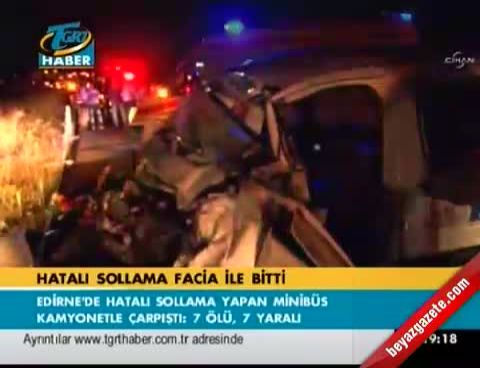 3 Eylül 2012 Pazartesi günü yayınlandı Edirne'de kamyonetle yolcu minibüsünün çarpıştığı kazada ölenlerin sayısı 7'ye yükseldi. Ölen ve yaralananların kimlikleri tespit edildi.