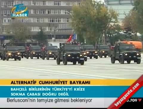 Bazı sivil toplum kuruluşlarının Ortadoğu'daki bazı özentilere heveslenerek 'halk hareketi başlatıyoruz', 'halk yürüyüşü yapıyoruz' derken Türkiye'yi bir krize sokmaları ve bunu da bazı siyasi partilerin sahiplenmelerinin doğru olmadığını belirten Bahçeli, 'Yıllardır yapılmış bayramların içerisinde neyi yapmak istiyorlarsa oraya gelmek suretiyle bu bayramı milletçe kutlamanın, ama eğer bir tepki de koyacaklarsa o tepkiyi de oradaki davranışlarıyla koymalarında yarar vardır. Yoksa alternatifler ortaya koyarak Türkiye'nin bölünmesine her alanda katkı sağlamak cumhuriyetçilik de değildir, milliyetçilik de değildir, vatanseverlik de değildir veya demokrat olma, özgür olmakta anlamını taşımaz ' dedi.