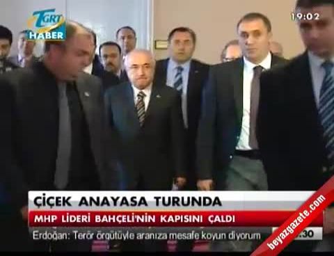 Liderlerden randevu talep eden ve ilk olarak dün akşam Başbakan Recep Tayyip Erdoğan ile bir araya gelen Çiçek, bugün de MHP Genel Başkanı Devlet Bahçeli ile bir araya geldi. Bahçeli'nin Meclis'teki makamında saat 12.00'de başlayan görüşmeye MHP Grup Başkanvekili Oktay Vural ve Meclis İdare Amiri Ali Uzunırmak ile Anayasa Uzlaşma Komisyonu'nun MHP'li üyeleri Faruk Bal ile Oktay Öztürk de katıldı