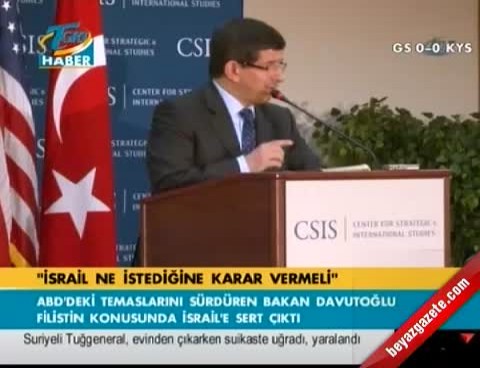 Bugün nereye giderseniz gidin tüm insanlık Filistin devletinin tanınmasının arkasında. Bazı dogmatik kişiler hariç herkes Suriye halkının taleplerinin yanında. Türkiye olarak Filistin'in devlet olarak tanınmasını destekleyeceğiz. Eğer hatta mümkünse yarın, bugün mümkünse bu saatte... Çünkü bu millet kendi devletlerini kurmayı hak ediyor. Eğer bunun için bir müzakere gerekiyorsa, İsrail, yerleşim konusu gibi herhangi bir peşin hüküm sergilemeden masaya gelmeli. Artık yeter. İsrail-Filistin meselesinin uzamasının bedelini, Türkiye de dahil olmak üzere bölgemiz halkı ödüyor. İsrailliler artık ne istediklerine bir karar vermeli. Yani Filistinlilerin demografik haklarından korkuyorlar ve 'bir devlet' mi istiyorlar veya 1967 sınırlarına dayanan, Doğu Kudüs'ün Filistin'in başkenti olduğu bir 'iki devletli' çözüm mü istiyorlar. Eğer iki devletli çözüm istiyorlarsa, o zaman, Filistin bölgelerine yeni yerleşim yerleri inşa etmek yerine masaya gelmeliler. Eğer 'bir devlet olmasın' diyorlarsa da bunu açıkça söylesinler. Böylece kimin barış istediğini, kimin istemediğini biliriz.''