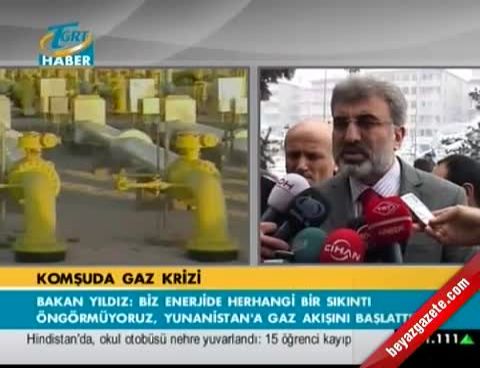 Enerji ve Tabi Kaynaklar Bakanı Taner Yıldız, '2023 Türkiye Vizyonunda Kayseri Turizmi'konulu programa katılmak üzere dün geceden Kayseri 'ye geldi. Erciyes Kayak Merkezi 'nde planlanan program yoğun kar ve tipi nedeniyle Büyükşehir Belediyesi Meclis Salonu 'na alındı. Programa katılması planlanan Kültür ve Turizm Bakanı Ertuğrul Günay da, kar engeline takıldığı için kente gelemedi. Bakan Taner Yıldız, belediyeye gelişi sırasında gazetecilerin sorularını cevapladı. Yunanistan 'a Türkiye üzerinde doğalgaz akışının sürüp sürmeyeceğinin sorulması üzerine Bakan Yıldız, Yunanlı meslektaşının aradığını ve zor durumda olduklarını söylediğini aktardı. Yıldız, 'Biz geçen hafta gerek batı hattında gerekse Azerbaycan ve İran doğalgaz hattında yaşanan sıkıntıdan dolayı Yunanistan 'da basınç düşüklüğü olmuş ve gaz veremiyorduk. Önceki gün Yunanlı meslektaşım aradı. Zorda ve sıkıntıda olduklarını söyledi. Şahsen ben dayanamadım. Aynı sıkıntıyı bizler de hissediyoruz. Herkes, her bakan sorumluluğu çerçevesinde kendi vatandaşlarına bu sıkıntıyı yansıtmak istemiyor. Biz de Ukrayna 'ya gittiğimde sağ olsun değerli meslektaşım Boykoy 'dan rica ettim. O da biraz depolarından verecek, biz de birşeyler yapacağız. Dolayısıyla dün Yunanistan 'a Yunanlı bakan arkadaşımızın ricasını kırmadık ve gaz akışını başlattık.'şeklinde konuştu.