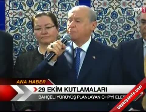 MHP Lideri Bahçeli, 29 Ekim günü yapılacak bayramın Türkiye'de bir krizin işareti olarak görülmesinin yanlış olacağını vurgulayarak şunları söyledi: 'Bu durum Türkiye'yi de önemli sıkıntılara sokabilir. Bu yanlıştan vazgeçilmelidir, ama siyaseten Cumhuriyetin kazanımlarının bu iktidar tarafından nasıl tahrip edildiğini, nasıl örselendiğini herhangi bir geniş alan oluşturan eylemlerin başlangıcı olarak değil, Meclis'te veya kamuoyunda aydınlar aracılığıyla, siyasiler aracılığıyla, sivil toplum kuruluşları aracılığıyla yapmaları ülkemiz açısından daha doğru olacaktır. '