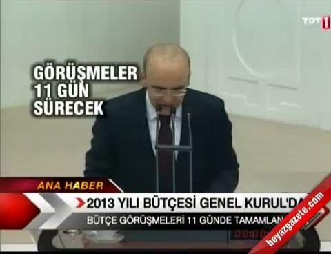 Liderlerin konuşacağı ilk günde Başbakan Recep Tayyip Erdoğan'ın geçen yıl olduğu gibi bu yılda ekonomideki olumlu havayı grafiklerle anlatması bekleniyor. Meclis'in bütçe maratonu sürüyor. TBMM Plan ve Bütçe Komisyonu'nun ardından bu kez Genel Kurul, 11 gün süreyle bütçe mesaisi yapacak. Genel Kurul'da, bütçenin tümü üzerindeki görüşmeler 10 Aralık Pazartesi günü yapılacak. Cumhurbaşkanlığı, TBMM Başkanlığı, Sayıştay, Anayasa Mahkemesi, Yargıtay, Danıştay, Başbakanlık, MİT ve MGK Genel Sekreterliği bütçeleri 11 Aralık Salı günü ilk oturumda, görüşülecek. Komisyon görüşmelerinde CHP'lilerin eylemine sahne olan Adalet Bakanlığı'nın bütçesi 12 Aralık Çarşamba günü, İçişleri Bakanlığı bütçesi 13 Aralık Perşembe günü, Sağlık Bakanlığı bütçesi ise 14 Aralık Cuma günü görüşülecek. Tasarının maddelerinin görüşmelerine 18 Aralık Salı günü devam edilecek ve 15. maddesine kadar oylanacak. 2013 Yılı Merkezi Yönetim Bütçe Kanunu Tasarısı ile 2011 Yılı Merkezi Yönetim Kesinhesap Kanunu Tasarısı'nın oylanmamış maddeleri, 19 Aralık Çarşamba günü yapılacak. Meclis bütçe görüşmelerine haftasonu da devam edecek.