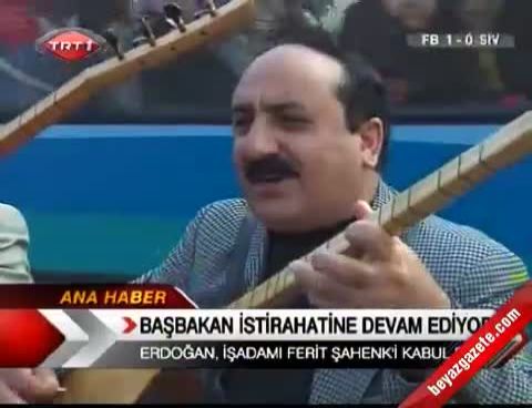 Ardahan'dan gelen iki ozan, Başbakan Erdoğan'la görüşemeyince geçmiş olsun dileklerini basın mensupları aracılığıyla saz çalarak ve türkü söyleyerek iletti.