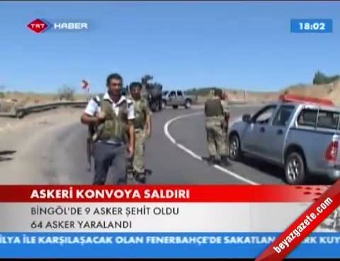 Bingöl’de haftasonu görevden dönen Çevik Kuvvet ekibine bombalı saldırıda 8 polisi şehit eden PKK’lı teröristler bu olaydan iki gün sonra bugün de askeri konvoya uzun namlulu silahlar ve roketatarlarla saldırdı. Elazığ’dan, Muş ve Van’a giden silahsız ve sivil kıyafetli 200 askerin bulunduğu konvoydaki otobüslerden biri roket isabet etmesi sonucu alev aldı, saldırıda 9 asker şehit oldu, 6’sı ağır 70 asker de yaralandı.