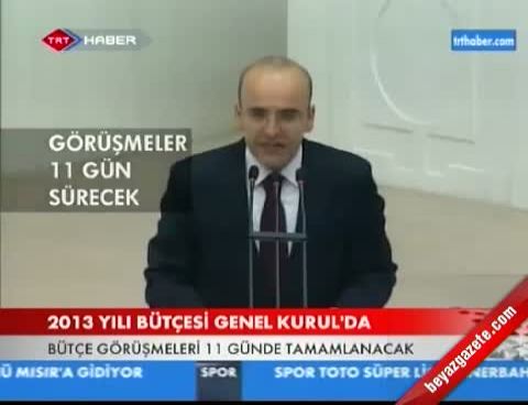 Liderlerin konuşacağı ilk günde Başbakan Recep Tayyip Erdoğan'ın geçen yıl olduğu gibi bu yılda ekonomideki olumlu havayı grafiklerle anlatması bekleniyor. Meclis'in bütçe maratonu sürüyor. TBMM Plan ve Bütçe Komisyonu'nun ardından bu kez Genel Kurul, 11 gün süreyle bütçe mesaisi yapacak. Genel Kurul'da, bütçenin tümü üzerindeki görüşmeler 10 Aralık Pazartesi günü yapılacak. Cumhurbaşkanlığı, TBMM Başkanlığı, Sayıştay, Anayasa Mahkemesi, Yargıtay, Danıştay, Başbakanlık, MİT ve MGK Genel Sekreterliği bütçeleri 11 Aralık Salı günü ilk oturumda, görüşülecek. Komisyon görüşmelerinde CHP'lilerin eylemine sahne olan Adalet Bakanlığı'nın bütçesi 12 Aralık Çarşamba günü, İçişleri Bakanlığı bütçesi 13 Aralık Perşembe günü, Sağlık Bakanlığı bütçesi ise 14 Aralık Cuma günü görüşülecek. Tasarının maddelerinin görüşmelerine 18 Aralık Salı günü devam edilecek ve 15. maddesine kadar oylanacak. 2013 Yılı Merkezi Yönetim Bütçe Kanunu Tasarısı ile 2011 Yılı Merkezi Yönetim Kesinhesap Kanunu Tasarısı'nın oylanmamış maddeleri, 19 Aralık Çarşamba günü yapılacak. Meclis bütçe görüşmelerine haftasonu da devam edecek.