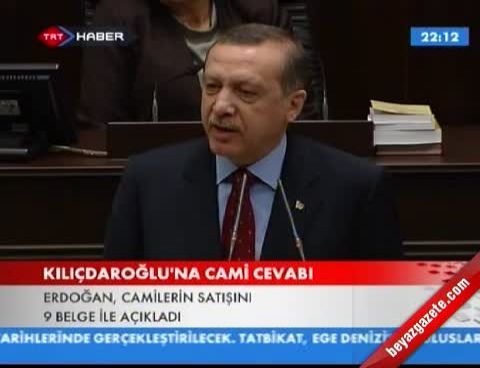 Erdoğan ardından CHP 'nin o dönemdeki bu uygulamalarına ilişkin resmi belgeleri gösterdi. Başbakan ilk olarak camilerin kapatılması ve ahırlara dönüştürülmesine yönelik 19 Kasım 1935 'te çıkarılan yasayı gösterdi. Camilerin satışını mümkün hale getiren bu yasada “Cami ve mescitler kendilerinden başkaca istifade edilmek üzere kapatılır.” ifadesinin yer aldığını aktaran Erdoğan, Türkiye 'nin her vilayetinde camiler kapatılmaya başlandığını kaydetti.