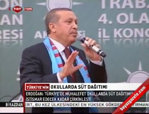 “Bununla kalmıyor diyor ki, ‘İkinci çirkinlik ihale yandaş kuruluşlara verildi’ diyor, orada da çarptı. İzmir’de haftada bir dağıttıkları sütü temin ettikleri firma ile bizim Ege ve Doğu Anadolu için süt temin ettiğimiz firma (Pınar Süt) ikimizde ondan alıyoruz. Eğer benim yandaşımsa senin de yandaşın, aynı yerden, İzmir’de haftada bir dağıttıkları bardakla verdikleri sütün fiyatı ile bizim sağlıklı ambalajlarda sütün fiyatını karşılaştıracak kadar da kendisini hesap uzmanı sanıyor. Antalya'ya 2009 seçimlerinde CHP'nin şimdiki belediye başkanının verdiği vaatleri unutmadık. Bu başkan seçim öncesinde 100 binden fazla öğrenciye süt dağıtacağını söylemişti. ‘Her çocuk güne süt içerek başlayacak’ diyordu. Aradan 3 yıl geçti şu anda sadece 30 bin öğrenciye süt dağıtabilir noktaya geldi. Antalya büyükşehir belediyesi hala CHP’de mi bilmiyorum, bu ara çok kavga ediyorlar her an her şey olabilir ama CHP’li ise Antalya’daki başkanını lütfen arasın ve sorabiliyorsa bu fiyaskonun hesabını sorsun. Milletim bunları inanmıyor ki. Hiç bir zaman dinlemedi bugün de dinlemeyecek. Yavrularımız analarının ak sütü gibi verdiğimiz sütü içmeye devam etsin. Biz bu şekilde seviyesiz çapsız ve sorumsuz bir muhalefete aldırmadan ülkemiz milletimiz ve coğrafyamız için eser üretmeye devam edeceğiz.”