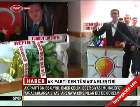 Adalet ve Kalkınma Partisi (AK Parti) Genel Başkan Yardımcısı Adana Milletvekili Ömer Çelik, Türk Sanayici ve İşadamları Derneği'nin (TÜSİAD), bir sivil toplum örgütünden çok muhalefet partisi gibi davrandığını savunarak, "Madem öyle partilerini kurup öyle çıksınlar karşımıza.