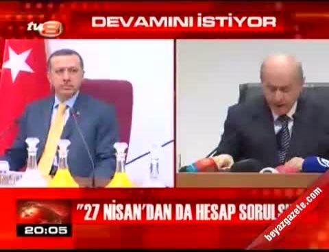 “Darbeye kim ya da kimler heves ettiyse, bu konuda her neviden plan, proje ve hazırlık içine kimler girdiyse hukuk karşısında hesap vermeleri mutlak anlamda sağlanmalıdır.” diyen Bahçeli, konuşmasına şöyle devam etti: “Nitekim demokrasinin itibarını, iffetini ve hakkını savunmak millet iradesini temsil eden bizlerin en temel ve tartışmasız sorumluluğu altındadır. Kendilerine güç ve yetki vehmederek alan açan, gayri meşru müdahalelerle millet emanetini gasp eden çevrelere kesinlikle gereğinin yapılması şarttır. 12 Eylül’de Parlamento'yu kapatanlara, 28 Şubat'ta balans ayarı yaparak suç işleyenlere, 27 Nisan’da siyasete şekil ve yön vermeye çalışanlara hak ettikleri yaptırım uygulanmalıdır. Bu tarihlerde darbecileri kışkırtanlar, işlenen suçlara iştirak edenler; kötü söz ve işkence yapan görevliler hakkında da ihmal edilmeden takibatlar başlatılmalıdır. Zira demokrasinin korunması ve yaşaması, iktidarın meşru yollardan tayini insanlığın bugüne kadarki en önemli kazanımlarından birisidir. Buna bir diyeceğimiz tabiatıyla olmayacaktır. Ancak darbecileri iyi ayırt etmek, Türk Silahlı Kuvvetlerini zan ve töhmet altına almamak herkesin, özellikle AKP hükümetinin dikkat etmesi gereken önemli bir husustur. Türk askerini topyekûncu bir bakışla darbeci, Peygamber ocağını ihtilalcı yüzlerin üreme ve yayılma merkezi olarak göstermek hem vicdansızlık hem de büyük haksızlık olacaktır.”