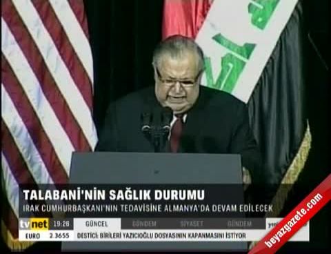 Beyin kanaması geçiren Irak Cumhurbaşkanı Celal Talabani, Bağdat'ta kaldırıldığı hastanede yoğun bakıma alındı. Irak Cumhurbaşkanlığı, damar sertliği tedavisi gören Talabani'nin vücut fonksiyonlarının yerinde olduğunu bildirirken, Reuters'e konuşan üç ayrı hükümet kaynağı da, Talabani'nin durumunun kritik ancak stabil olduğunu ifade etti.